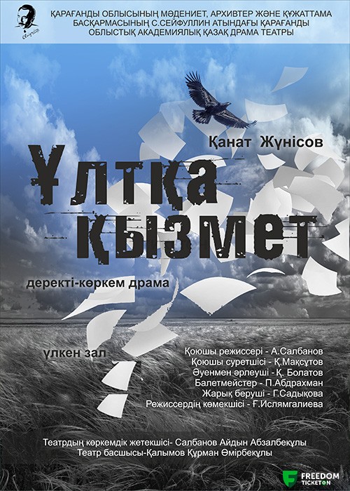 Жиырмасыншы ғасыр басындағы осы бір күрделі кезеңдерден сыр шертетін Қ.Жүнісовтің «Ұлтқа қызмет» деректі-көркем драмасы, Тәуелсіздіктің 30 жылдығына орай сахналанды. Ә.Бөкейханов бастаған қайраткерлердің азаттық жолындағы арпалысы, ауыр тағдыры суреттелетін спектакль тарихи оқиғалар негізінде жазылған. Ұлттық рухымызды күшейтіп, ұрпақты отан сүйгіштікке тәрбиелейтін туынды, ерлік пен елдікті танытады. Шиеленіскен оқиғалар режиссерлық тың шешімдер арқылы шарықтау шегіне жетеді. Ұлт-азаттық қозғалысы көсемдерінің азаматтық тұлғасы актерлық шеберлік арқылы көрерменге жол тартады. Бұл Алаш тақырыбын кең ауқымда қамтыған тұңғыш қойылым. Арыстар рухына бас иіп, театр сахнасынан тұлғалар жайлы спектакль тамашалаңыздар!